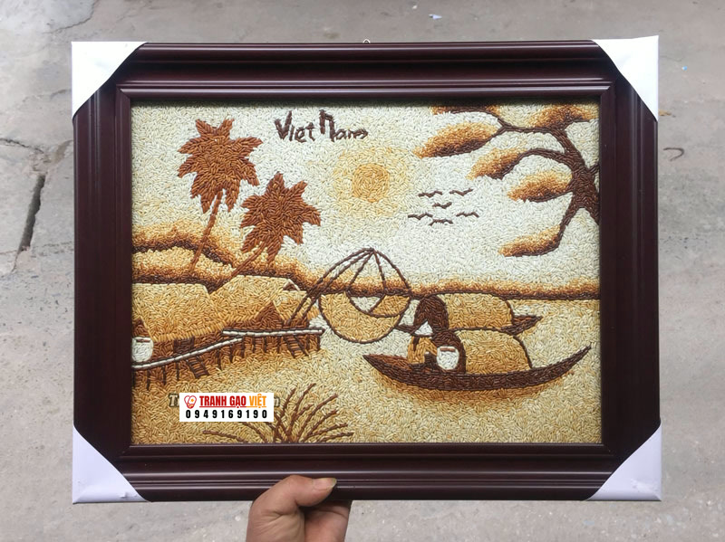 Tranh gạo phong cảnh miền quê sông nước việt nam thích hợp làm quà tặng đi nước ngoài. Tranh được xếp thủ công bằng hạt gạo