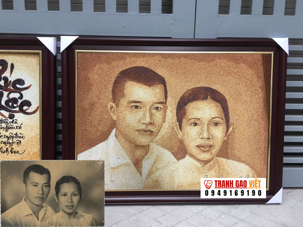 Tranh gạo chân dung 2 bác thời trẻ. Món quà tặng ý nghĩa khách đặt