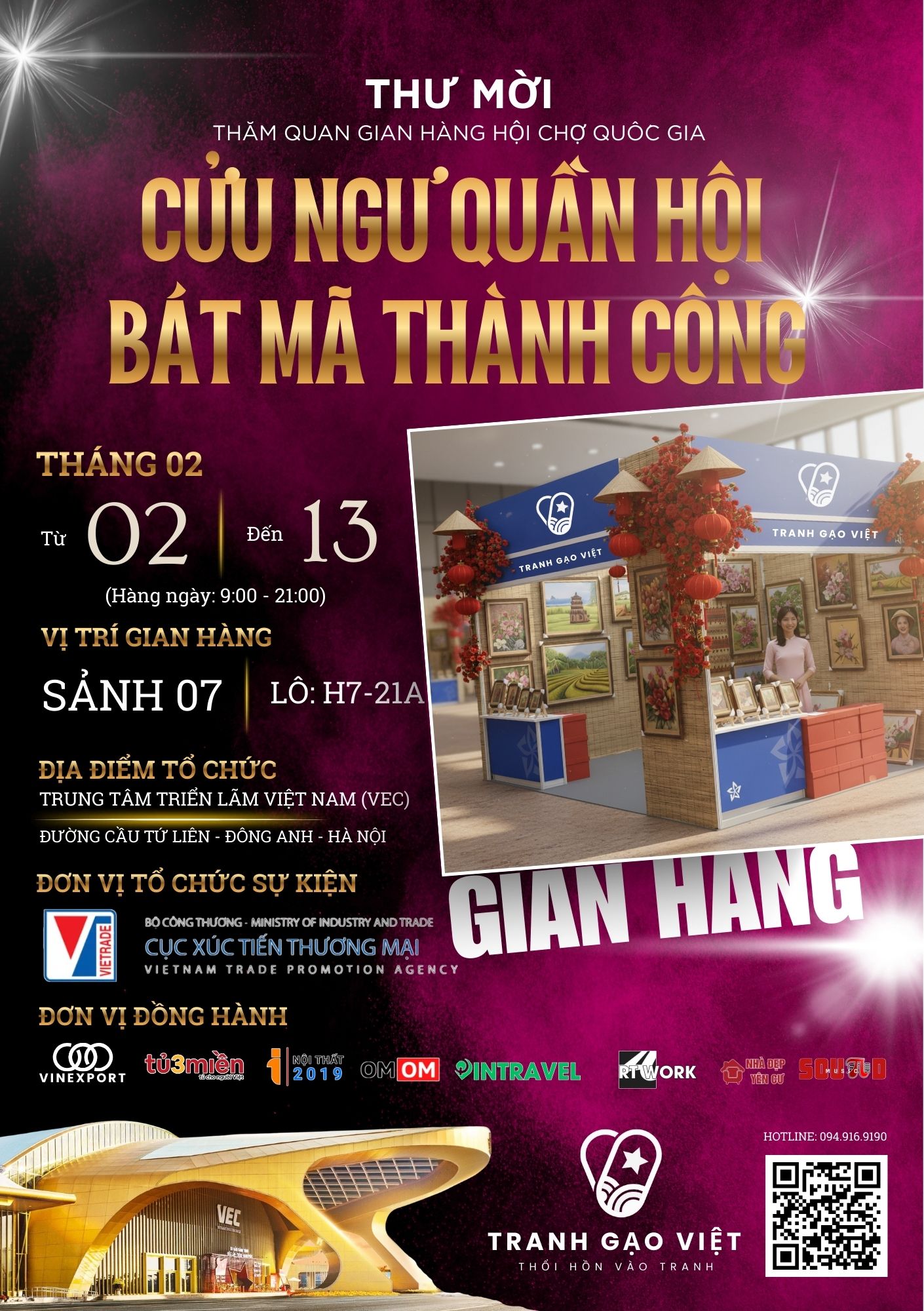 Tranh Gạo Việt trân trọng kính mời Quý khách hàng và Quý đối tác tới tham quan gian hàng trưng bày tranh gạo nghệ thuật trong khuôn khổ Hội chợ Quốc gia 2026, diễn ra tại Trung tâm Triển lãm Việt Nam (VEC).