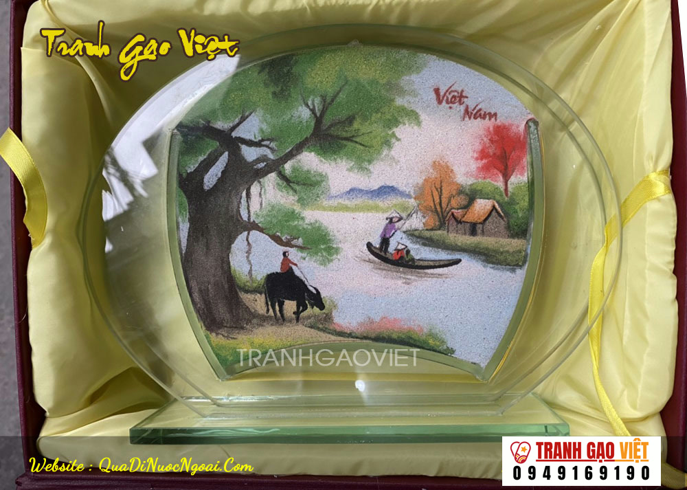 Tranh cát quà lưu niệm Việt Nam là một sản phẩm nghệ thuật độc đáo được làm từ cát và màu sắc tự nhiên. Bức tranh được vẽ trong khung thủy tinh