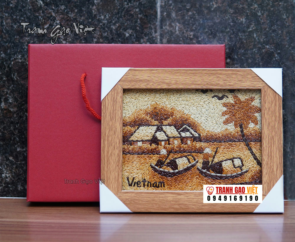 Tranh gạo để bàn chèo thuyền phong cảnh sông nước miền tây