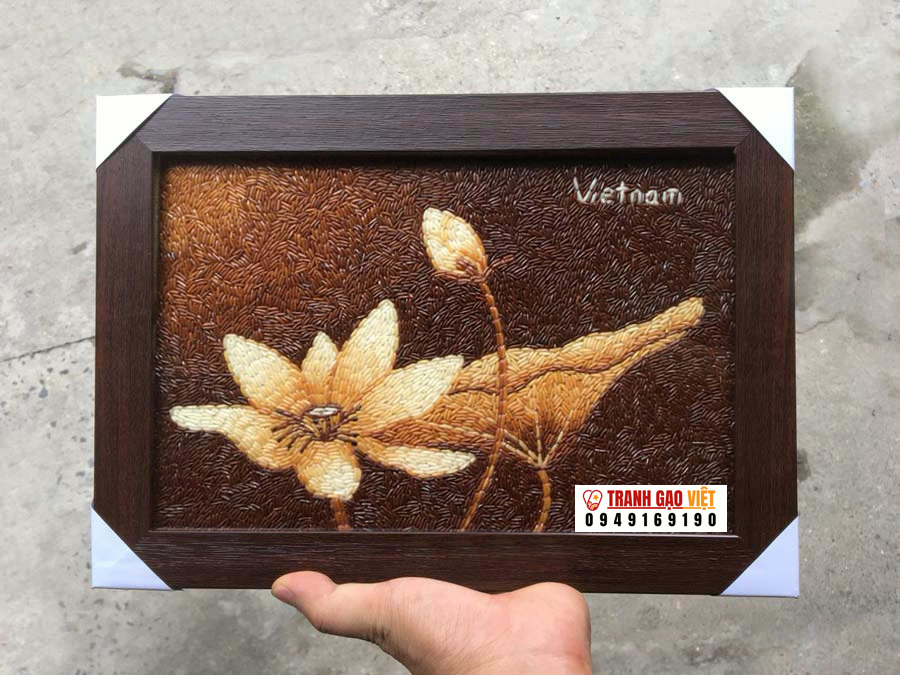 Tranh gạo hoa sen khổ nhỏ gọn thích hợp treo trang trí hoặc làm quà tặng. Tranh có khung kính và hộp đầy đủ