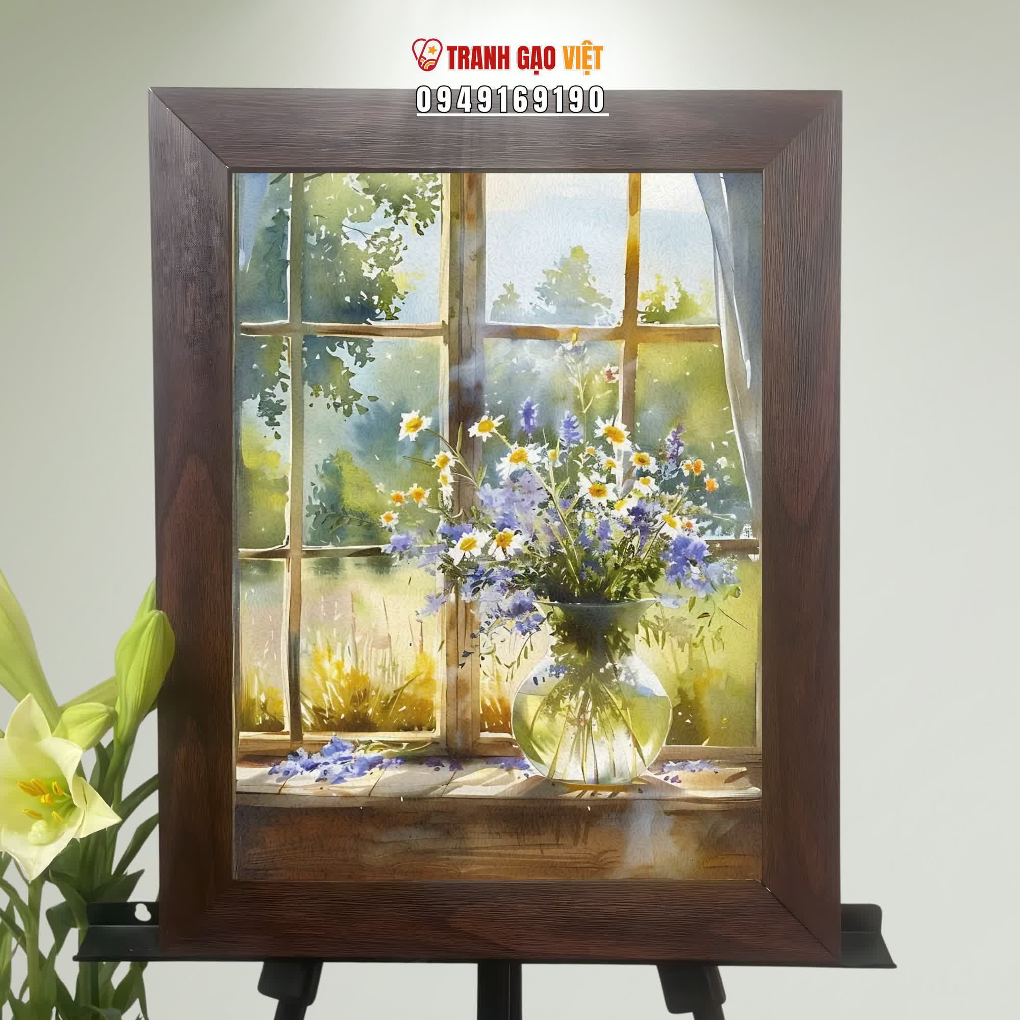 Tranh Gạo Lẵng Hoa Bên Cửa Sổ - Tranh Nghệ Thuật - Tranh Tặng Quà - Tranh Thủ Công