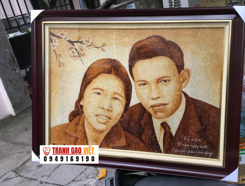 Tranh chân dung gạo rang khách đặt làm quà tặng cha mẹ kỷ niệm 50 năm ngày cưới
